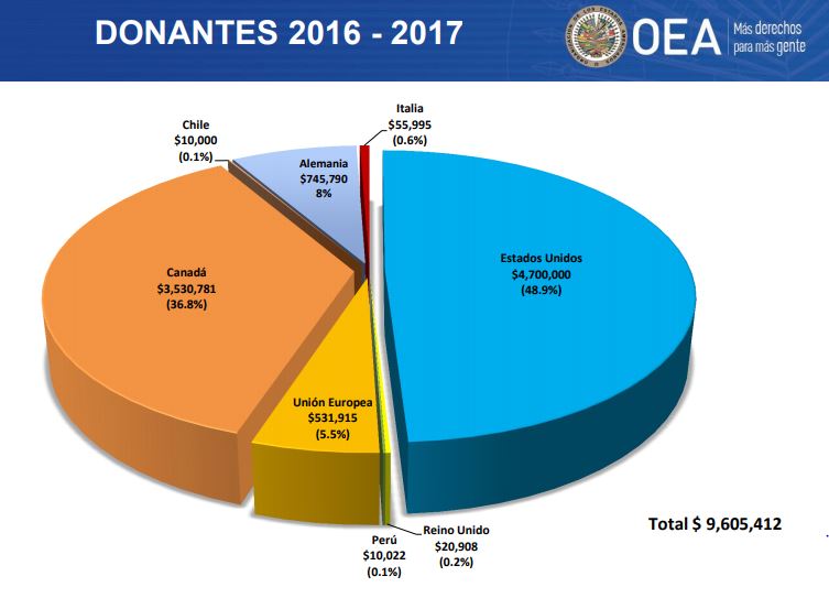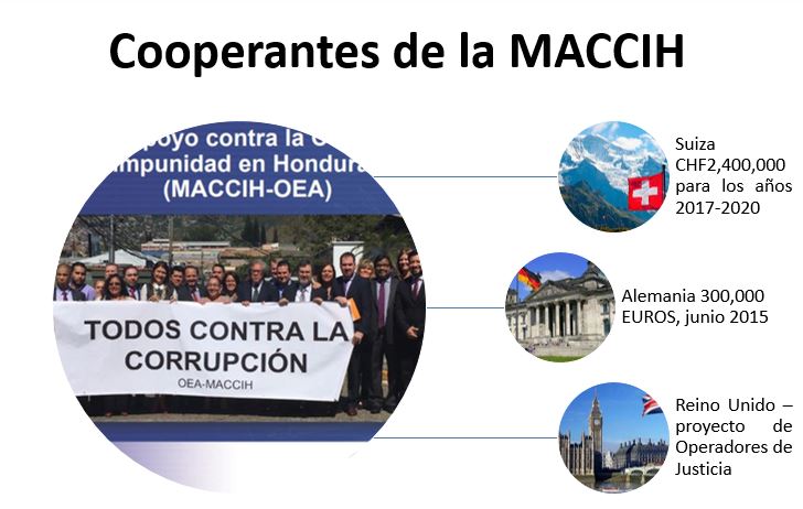 Los gobiernos que apoyan presupuestariamente a la MACCIH son Reino Unido, Alemania, Estados Unidos, Perú, Canadá, Chile, Italia, Unión Europea y Suiza.