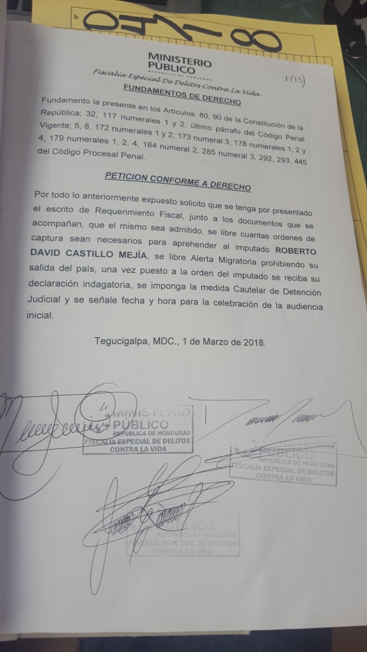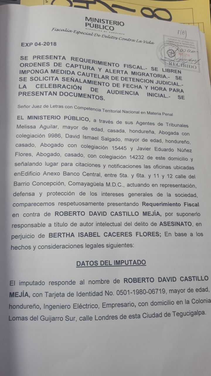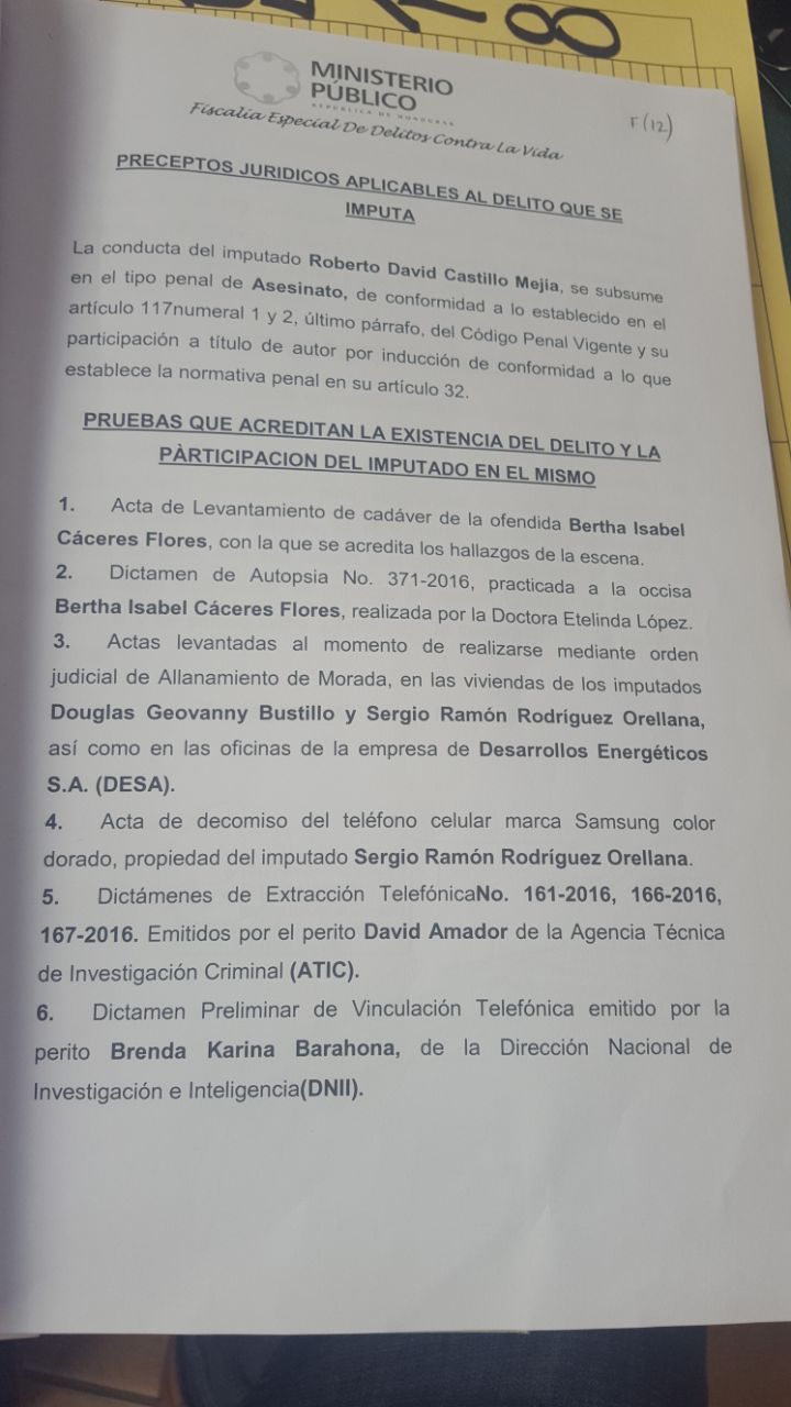 El expediente cita también que «las manifestaciones lideradas por la ofendida Berta Isabel Cáceres Flores, en su momento lograron la pérdida de financiamiento extranjero que paralizó la construcción del proyecto en su ubicación original…lo que llevó a generar grandes pérdidas a los socios de esa empresa», cita el requerimiento fiscal presentado por el Ministerio Público.