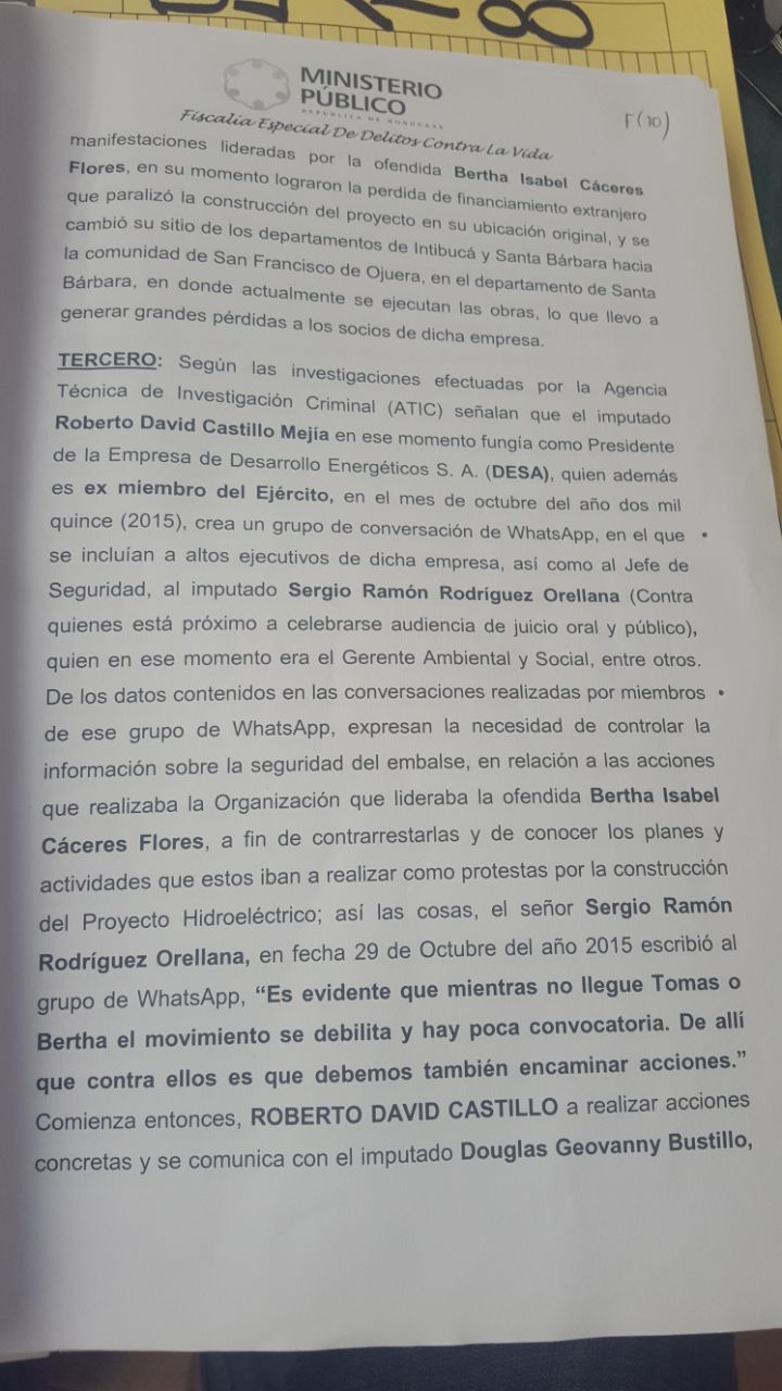 Tegucigalpa, Honduras (Reporteros de Investigación). A partir del momento que altos ejecutivos de la empresa -que participaban en un grupo de WhatsApp- dijeron que debían encaminar acciones contra Tomás Membreño y Berta Cáceres, el presidente ejecutivo de la Sociedad Mercantil Desarrollos Energéticos (DESA), el militar Roberto David Castillo Mejía, empezó a planificar la ejecución del asesinato.