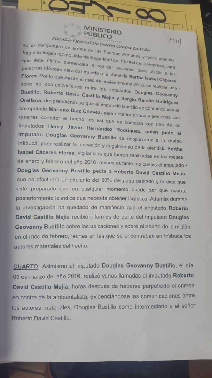 «Es evidente que mientras no llegue Tomas o Bertha el movimiento se debilita y hay poca convocatoria. De allí que contra ellos es que debemos también encaminar acciones«. Comienza entonces, Roberto David Castillo a realizar acciones concretas y se comunica con el imputado con el imputado «David Geovanny Bustillo su ex compañero de armas de las Fuerzas Armadas y quien además había trabajado como Jefe de Seguridad del Plantel de la Represa, para que éste último comenzara a realizar acciones para ubicar a personas idóneas para dar muerte a la ofendida Berta Isabel Cáceres», dice el requerimiento fiscal presentado por el Ministerio Público.