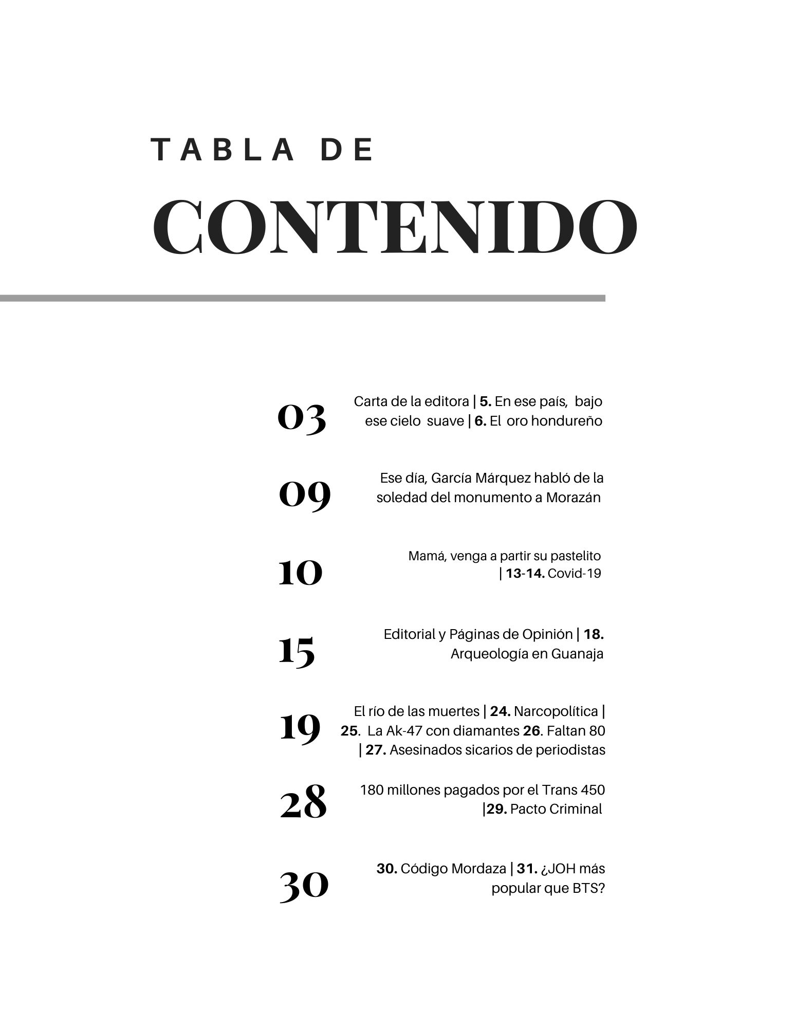 Es la primera vez en Honduras que nace un medio de comunicación escrito enfocado en la investigación periodística. Además la revista dará un importante espacio para investigar temas relacionados con el arte y la cultura para generar espacios de educación y de crecimiento de la nación. Ofrecemos en PDF nuestra revista de 32 páginas que en 2020 tendrá dos ediciones y serán distribuidas gratuitamente.