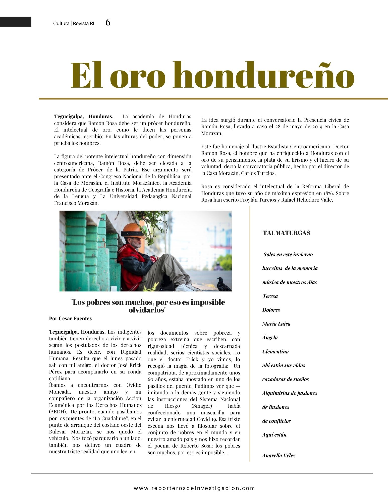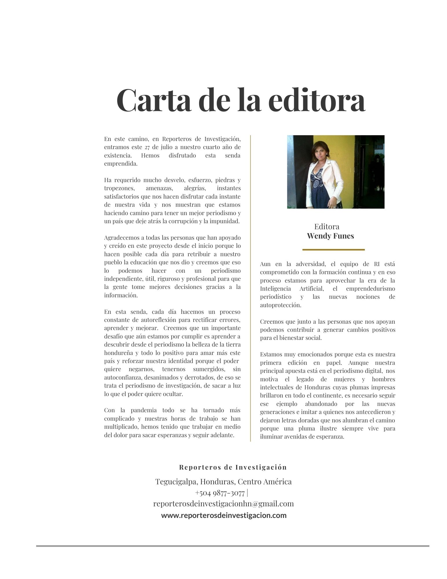La primera edición de la revista saldría en junio, pero el toque de queda, decretado en Honduras desde marzo, evitó que la impresión fuera realizada en ese mes. Si desea obtener la revista en PDF puede escribirnos a reporterosdeinvestigacionhn@gmail.com para solicitarla.